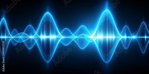 Vibrant neon blue sound wave shapes undulate and pulse through a dark futuristic digital landscape, evoking a sense of cutting-edge audio innovation and advanced technology.