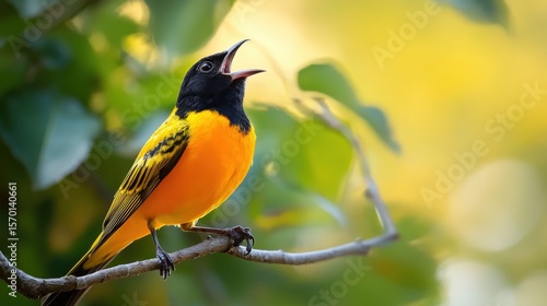 Vibrant orange and black bird perched on a branch.