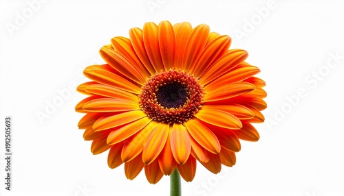 Vibrant orange gerbera daisy flower in full bloom, showcasing its detailed petals and dark center. This beautiful, single floral object is perfectly isolated on a clean, bright white background.