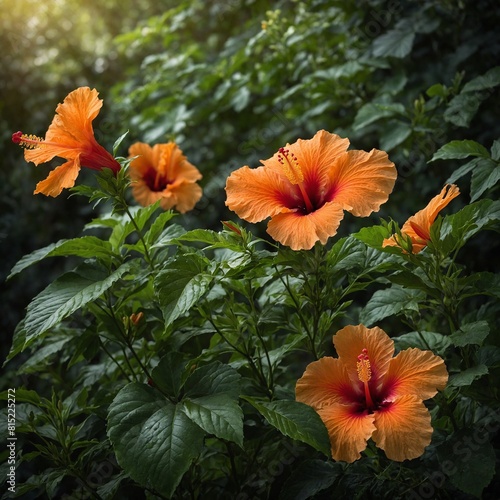 Vibrant orange hibiscus flowers bloom amidst lush green foliage, basking in soft sunlight that filters through leaves. Blossoms, with their intricate stamen, pistil structures.