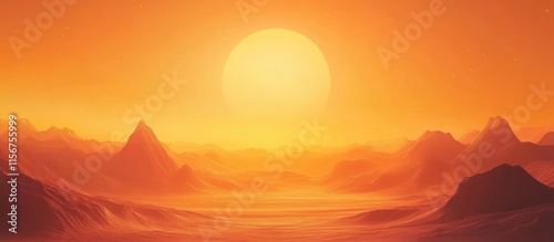 Vibrant orange sunset casting a warm glow over mountains with ample space for text or graphics in a serene landscape setting