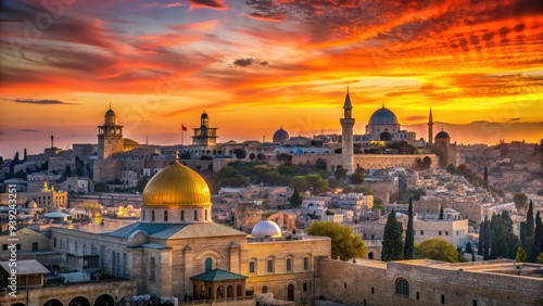 Vibrant oranges and pinks illuminate the ancient cityscape of Jerusalem as the sun rises over the historic walls and domes of the old city.