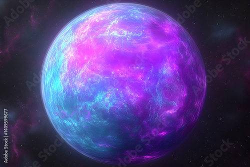 Vibrant, otherworldly planet glows with swirling nebulae.