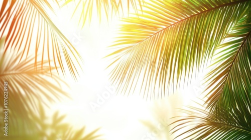 Vibrant palm leaves frame a glowing background, creating a tropical and serene atmosphere.