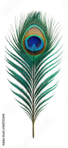 Vibrant peacock feather with iridescent blue and green eye pattern