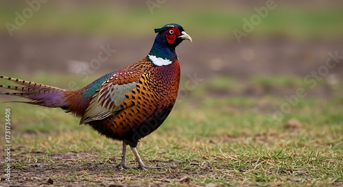 Vibrant pheasant displaying colorful plumage on grassy ground outdoors