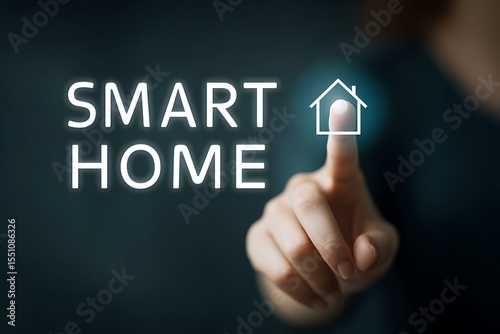 Vibrant photo of person touching a smart home icon on a virtual screen with the text "SMART HOME" in white, representing a technology and digital concept for remote control of.