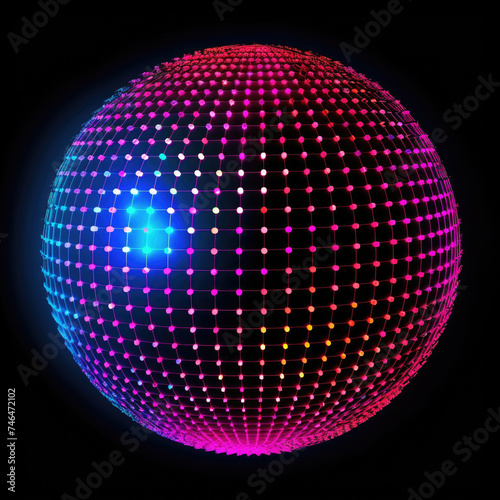 Vibrant pink and blue neon grid sphere glowing on black background