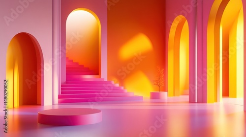 Vibrant pink and orange architectural scene with arched doorways, stairs, and platforms, bathed in warm light