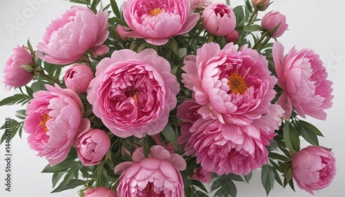 Vibrant pink peonies and roses bouquet, white backdrop , elegant, spring