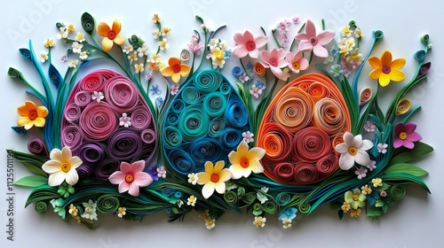 Vibrant quilled easter eggs with colorful flowers in intricate design