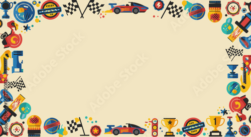 Vibrant Racing Frame with Cars, Checkered Flags, and Trophies