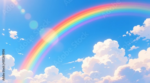Vibrant rainbow arching over luminous cloudscape under clear blue sky