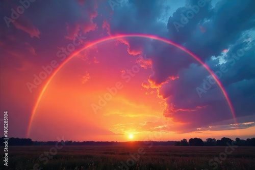 Vibrant rainbow arcing across a dramatic sunset sky , optical illusion, breathtaking