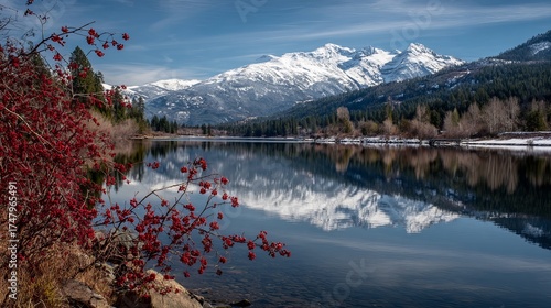 Vibrant red berries frame serene lake reflecting snow-capped mountains under a clear blue sky