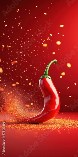 Vibrant red chili pepper surrounded by spice particles, evoking heat and flavor in a bold, colorful setting.
