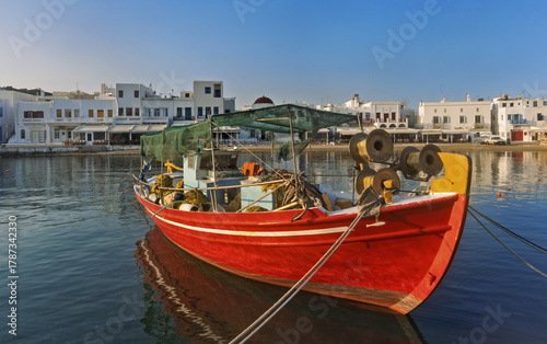 Vibrant red fishing boat docked in a calm harbor in Mykonos, equipped with nets and winches, tied with ropes to the dock,