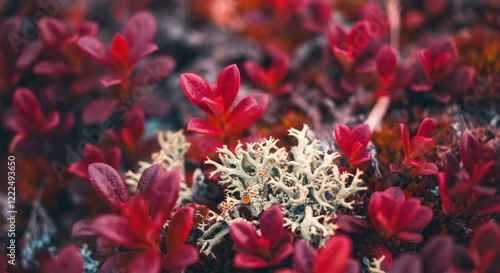 Vibrant red foliage with contrasting green lichen in a natural setting