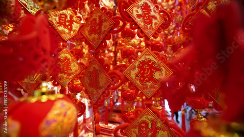 Vibrant red lanterns with intricate designs dangle from above, creating a festive atmosphere at a traditional celebration