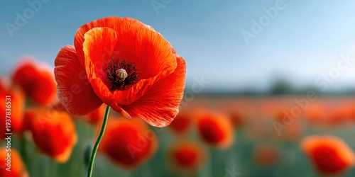 Vibrant red poppy flower in sharp focus against a soft, blurred field of poppies