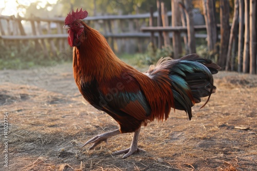 Vibrant Rooster Standing in Farmyard with Wooden Fence and Hay.Nature's Majesty Unleashed