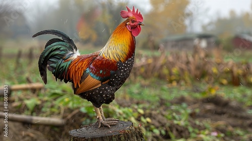 Vibrant Rooster Struts Confidently Across a Farm on a Misty Day
