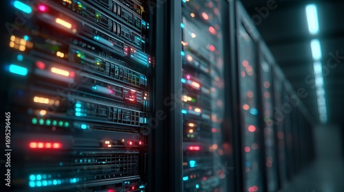 Vibrant server room glows with dynamic data flow, showcasing cutting-edge technology and powerful digital infrastructure for innovation and growth.