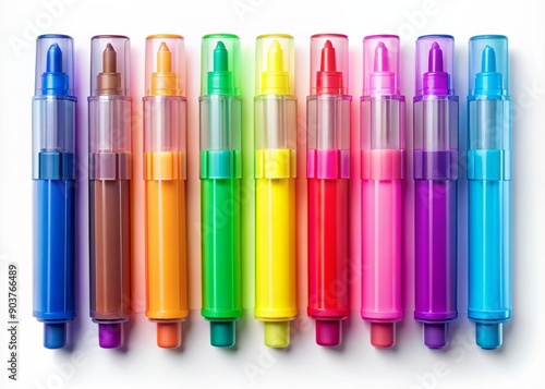 Vibrant set of assorted colorful highlighter pens with transparent tips and caps, arranged in a scattered formation, isolated on a transparent background.