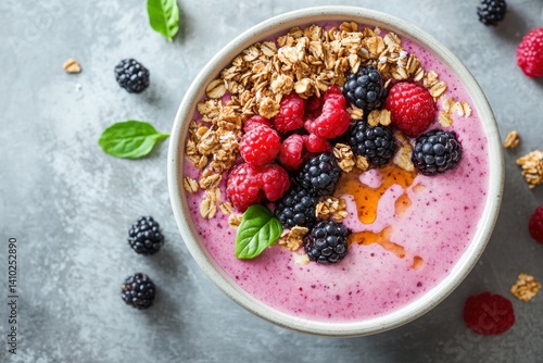 Vibrant smoothie bowl adorned with fresh berries and crunchy granola highlights the morning meal experience
