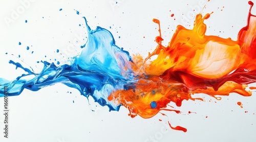 Vibrant splashes of blue and orange paint on white