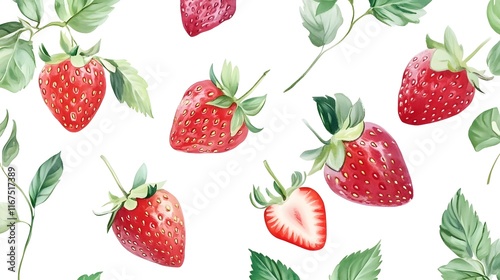 Vibrant Strawberries with Lush Foliage on Plain Background