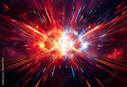 Vibrant streaks of red and blue light dramatically converge, creating a powerful visual clash at the center. Dynamic energy and intense motion are depicted in an abstract style.