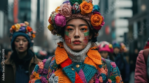 Vibrant street portrait of a woman in colorful flower headdress