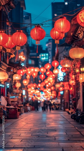 Vibrant streets adorned with glowing red lanterns during twilight.