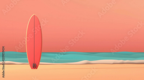 Vibrant Summer Scene with Surfboard Against Calm Ocean and Colorful Sunset Background