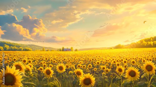 Vibrant, sunflower fields, golden blooms, high quality, photorealistic, summer, cheerful, idyllic, rural, panoramic, breathtaking, countryside