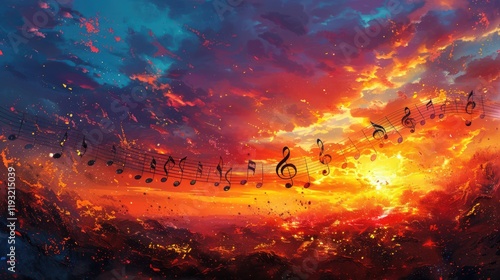 Vibrant sunset landscape with musical notes floating in the sky.