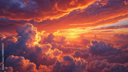 Vibrant sunset over a sea of clouds, fiery orange and purple hues.