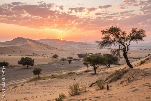 Vibrant Sunset Over Sand Dunes and Sparse Vegetation Generative AI