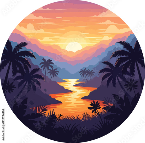Vibrant Tropical Sunset with Jungle Silhouette