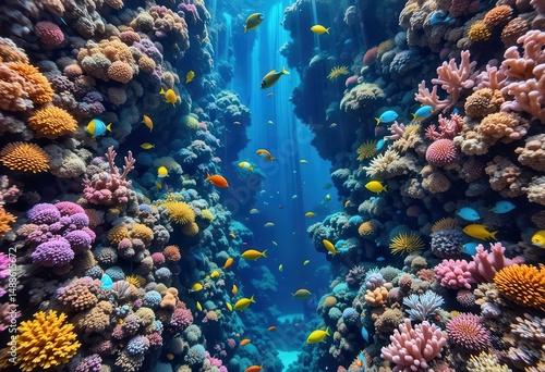 Vibrant underwater coral reef teeming with colorful fish in a serene ocean environment