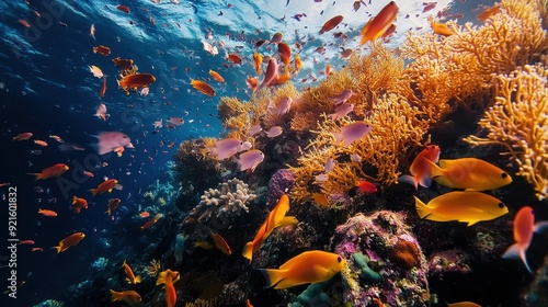 Vibrant Underwater Scene with Colorful Fish and Coral Reefs.
