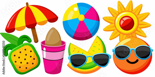 Vibrant vector seamless pattern with a colorful beach ball, umbrella, and summer toys, perfect for a bright vacation design