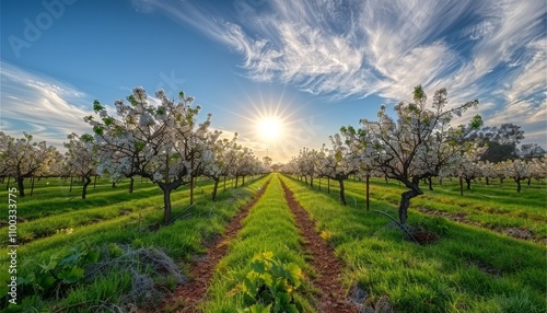 Vibrant vineyard featuring blooming grapevines illuminated by bright late spring sunlight