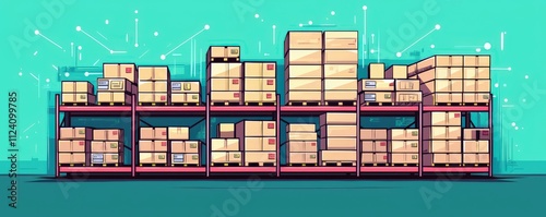 Vibrant Warehouse Storage Illustration Featuring Boxes on Shelves with Abstract Technology Background and Modern Visual Elements