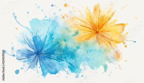 Vibrant watercolor background transitioning from blue to yellow with floral elements and soft splashes and copy space