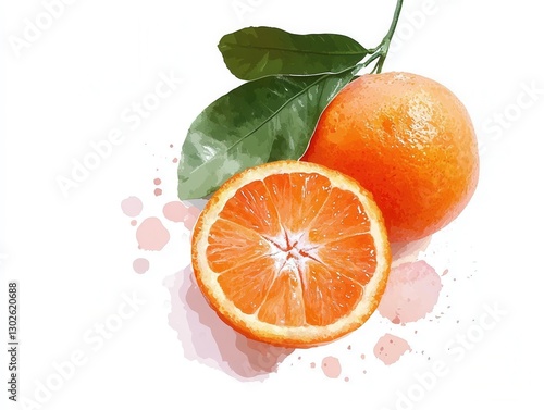 Vibrant watercolor of fresh whole and sliced orange with green leaves.