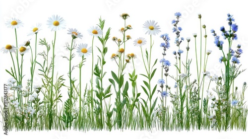 Vibrant Wildflower Meadow Daisies, Chicory, and Grasses Isolated on White Background - High-Resolution Stock Photo
