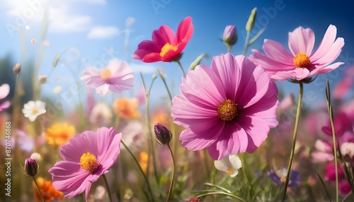 Vibrant wildflowers in full bloom under clear blue sky on a sunny day. Generative AI