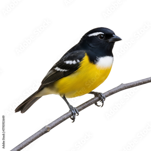 Vibrant yellow bird perched delicately on a slender branch against a stark setting